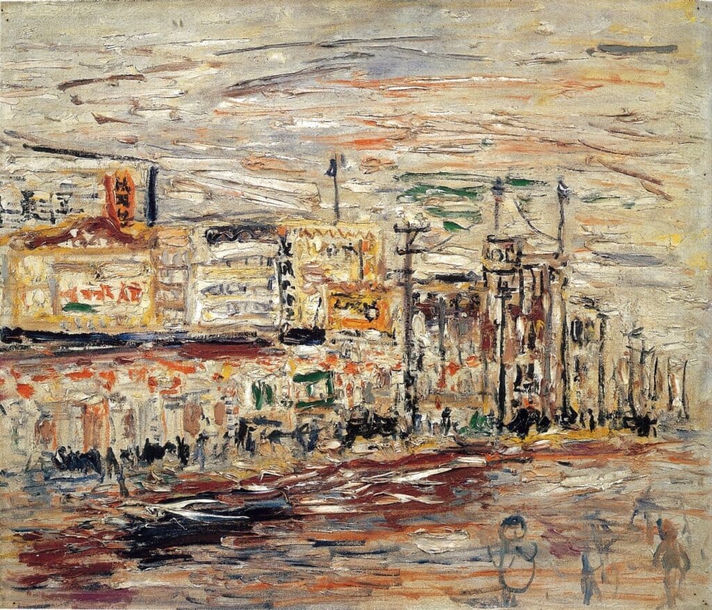 しかし生活面では放浪と飲酒に明け暮れ、住所を定めることなく簡易宿泊所を転々とする日々を送りました。絵具をチューブから直接キャンバスに擦りつけ、ナイフや指で描くという独自の技法で、東京の街並みや酒場、人物像を即興的に描き続けました。1940年、三河島の路上で行き倒れとなり、養育院に収容されたのち、49歳で亡くなっています。