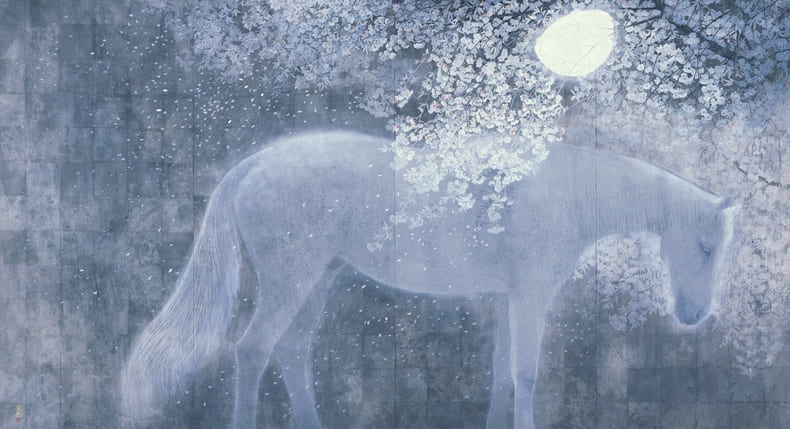 西田俊英の受賞歴は多岐にわたります。1983年に山種美術館賞展で優秀賞を受賞したのを皮切りに、1984年には東京セントラル美術館日本画大賞展で大賞を受賞しました。1995年に日本美術院賞(大観賞)と第1回足立美術館賞を同時受賞し、1997年には2度目の日本美術院賞を受賞しています。2002年には孔雀の屏風図「キング」で文部科学大臣賞、2005年には桜と白馬を描いた「きさらぎの月」で内閣総理大臣賞を受賞しました。