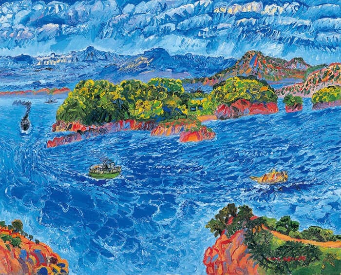 野間仁根作品の中で最も高く評価されるのが、故郷・瀬戸内海を描いた油彩風景画です。船が描き込まれた瀬戸内の風景画は特に高価買取の対象とされており、晩年の全盛期に描かれた細密で色彩豊かな作品は、代表作レベルのクオリティになると30万〜60万円前後の買取価格が期待できます。内容によっては100万円前後での取引も起きており、作品の出来によっては数百万円に達する場合もあるとされています。