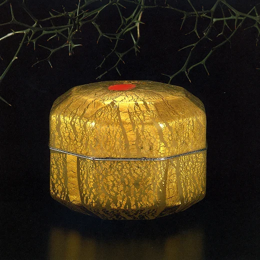 飾筥シリーズは、琳派の伝統美を色ガラスと金箔・銀箔でガラス素材に表現しようとした藤田の試行錯誤の集大成です。蓋付きの正方形あるいは六角形の箱に様々な色合いの色ガラスと金箔・プラチナ箔を溶かし込み、日本の漆器を想起させる重厚かつ華やかな装飾を施した装飾芸術品として世界に評価されました。「源氏物語」「竹取物語」など日本の古典文学の世界観も作品に織り込まれています。