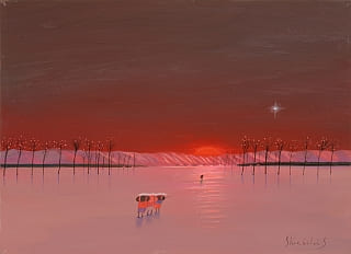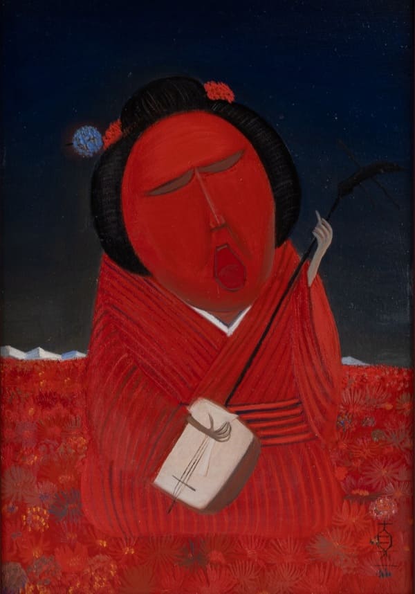 斎藤真一の作品でひときわ目を引く鮮烈な赤色(朱色)には、具体的なエピソードがあります。杉本キクエがまだ目が見えた幼い頃、母親に背負われて見た景色を思い出し「夕日が赤い」と言った言葉を、斎藤が受け止めたものです。月明りや真っ赤な夕陽に照らされた雪道を身を寄せ合って歩く瞽女たちの姿は哀感に満ちながらも、大きく口を開けて歌う姿からは生きる情熱と凛とした力強さが伝わります。この独自の色彩と世界観が「斎藤真一=越後瞽女日記の画家」というブランドイメージを形成し、現在の市場評価の基盤となっています。