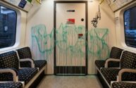 消毒清掃員に扮した男性がロンドン地下鉄社内でくしゃみを飛ばすネズミなどの落書きを行っている内容で、マスクの着用を促すメッセージと見て取れます。