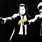 サミュエル・L・ジャクソンとジョン・トラボルタが演じるキャラクターが描かれ、映画では銃を構えていたものの、本作は銃の代わりにバナナを構えているポップな作品です。